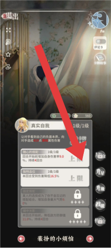 1、进入“真实自我”卡牌界面,点击红色箭头指向的【上限】标识,消耗对应资源,提升该卡牌属性上限,增强角色能力。