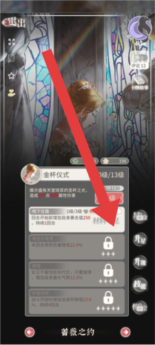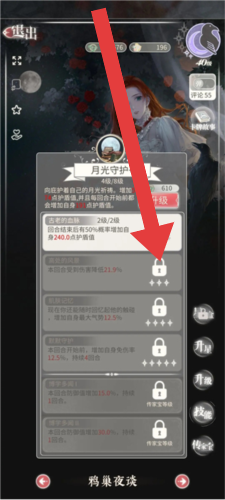 3、面对“月光守护”卡牌,按箭头方向,消耗资源解锁被锁的属性提升项,拓展卡牌养成维度,强化角色战力。
