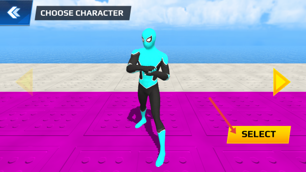 3、在角色选择界面,点击【SELECT】按钮,选定蓝色蜘蛛侠形象的角色,开始游戏。