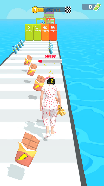 1、进入游戏后通过滑动屏幕操控角色左右移动,在色彩斑斓的赛道上收集咖啡杯、能量瓶等清醒道具,同时快速闪避枕头堆、催眠云朵等嗜睡障碍。