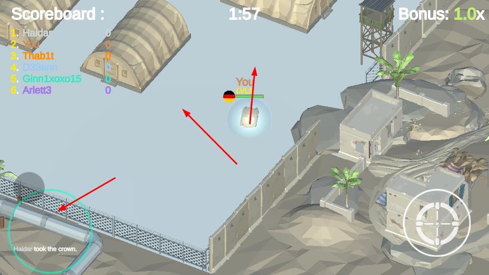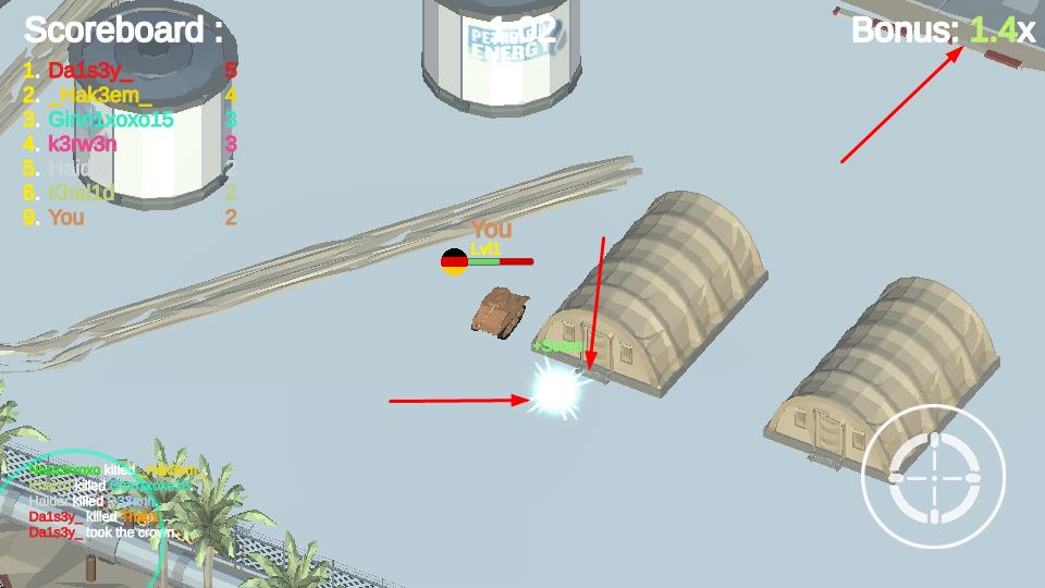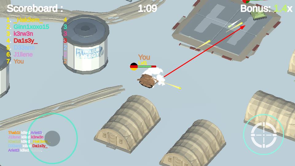 1、操控坦克在战场场景中移动、射击,与其他玩家操控的坦克对战,通过攻击淘汰对手,提升排名。