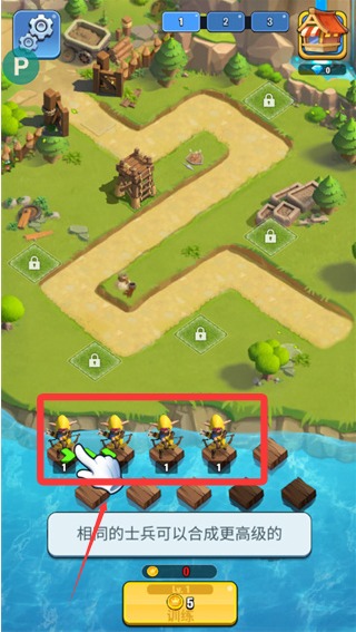 2、相同的士兵可以合成更高级的,滑动即可合成。