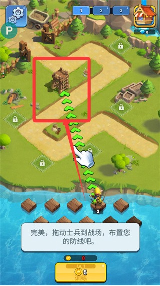 1、战斗中敌人沿着预定路线持续推进,玩家需利用战场两侧的塔楼位置,派遣士兵阻击敌人前进,确保基地安全。