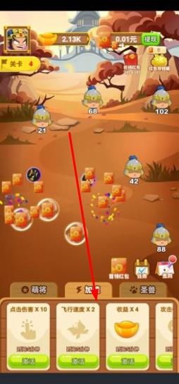 3、在对战场景中滑动屏幕调整角度,点击发射按钮释放技能,利用道具增强攻击,击败敌方武将赢取胜利。