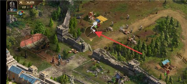 3、探索地图时,点击带有交互标识(如飞艇、风车旁)的区域,完成任务或获取资源。