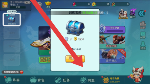 1、进入游戏,看“训练宝箱”提示,点击【开启】,消耗对应资源(如金币),获取宝箱内奖励,助力前期养成。