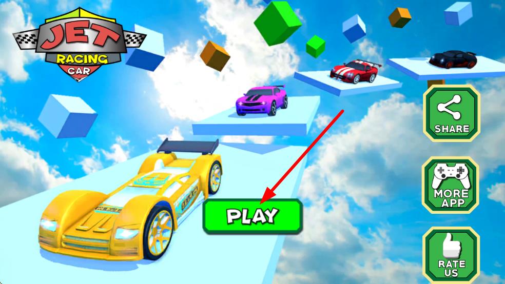 1、进入游戏主界面,点击“PLAY”按钮,从展示的赛车中选定初始赛车,开启高空赛道竞速之旅。
