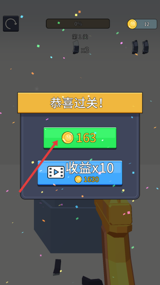 3、成功过关后,点击绿色“163”金币按钮,领取奖励,可用于升级武器等,推进游戏。