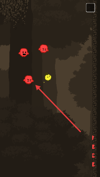 3、冒险过程,小鸡发射黄色攻击物对抗红色幽灵敌人,在森林环境中战斗闯关。