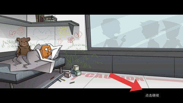 2、这是画面截图,呈现的是场景,有角色、场景元素、文字【点击继续】是交互提示,但从画面风格看属于冒险或解谜类游戏的过场/初始场景。