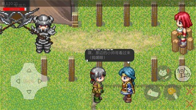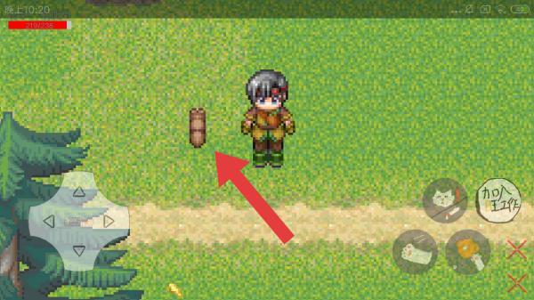 3、呈现角色(像素人物)、场景(草地、树木、道具木桶)、操作按键等,是角色在场景互动、探索的界面,玩家可操控角色移动、互动,开展生存或冒险玩法。