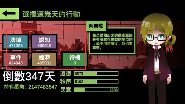 2、通过参与处理法律、认知、事件和经济可以让这些数值发生改变,而怎么改变,力度如何则就完全取决于玩家的决策了。
