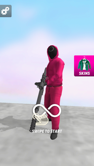 1、画面中是穿着粉色连帽套装、持武器的角色,有SWIPETOSTART(滑动开始)提示,从角色外观看,和鱿鱼相关衍生有关联。