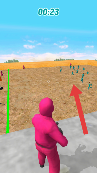2、从角色穿着粉色连体衣,画面中显示游戏剩余时间00:23,场景有不同颜色的人物角色,还有开阔的户外场地,角色持有武器,是射击对战类玩法。