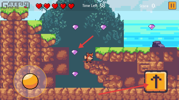 3、在关卡场景,操控狐狸角色,借助右侧跳跃按钮,收集紫色钻石推进游戏。