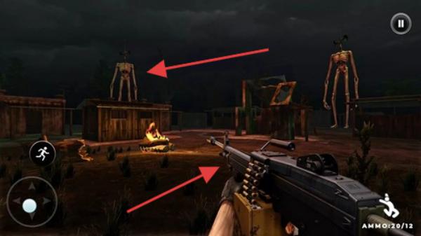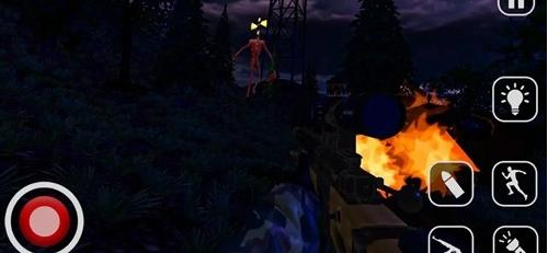 2、夜晚场景,玩家持武器面对警笛头,可战斗或探索。