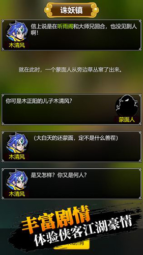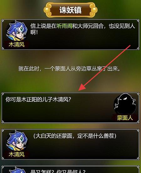 3、在【诛妖镇】剧情对话,选择回应蒙面人提问的选项,推进故事发展,解锁新任务与场景。