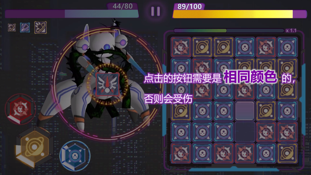 3、战斗时,遵循【点击的按钮需要是相同颜色的,否则会受伤】规则,消除同色方块,攻击敌人。