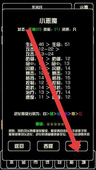 1、在宠物界面,查看小恶魔属性(生命、攻击等),点击【进化】,消耗资源提升星级(白→绿等),增强战力。