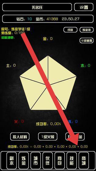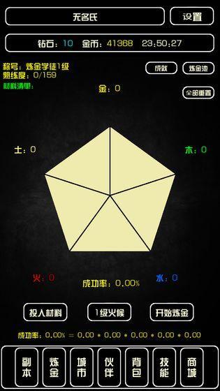2、进入炼金页,选“炼金术徒1级”,投入材料(1级火候),点击【开始炼金】,利用五行属性,尝试合成道具。