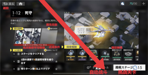 1、进入关卡“1-12:死守”,查看达成条件(光灵编队平均等LV.5等),点击【挑战关卡】,搭配阵容战斗。