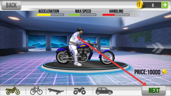 2、在车辆选择界面,选心仪摩托(如蓝色款),点击“NEXT”,确认车辆属性。