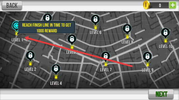 3、进入关卡地图,按箭头指向,选“LEVEL1”,限时抵达终点,获取奖励,开启后续竞速挑战。