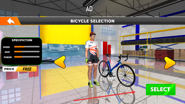 3、在车库,确认蓝色自行车属性后,点“SELECT”,开始特技骑行关卡。
