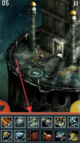 2、塔楼场景(第05层),角色在环形平台,下方是技能/道具栏,可选择技能应对挑战。