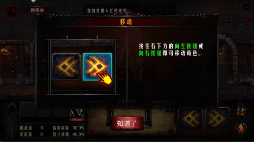 1、在教程关卡界面,按住右下角红框标注的移动按钮操控角色行进,按照指引前往红色光照区域完成基础移动教学。