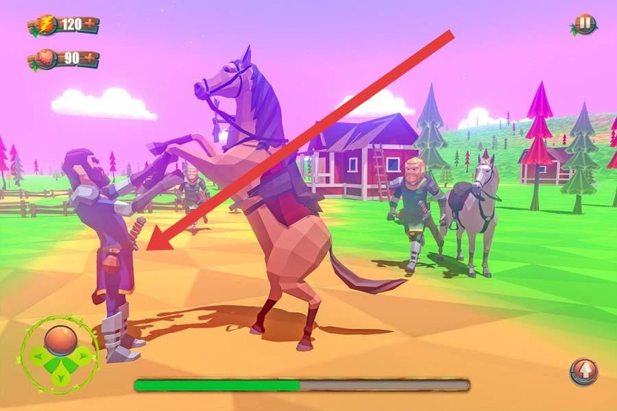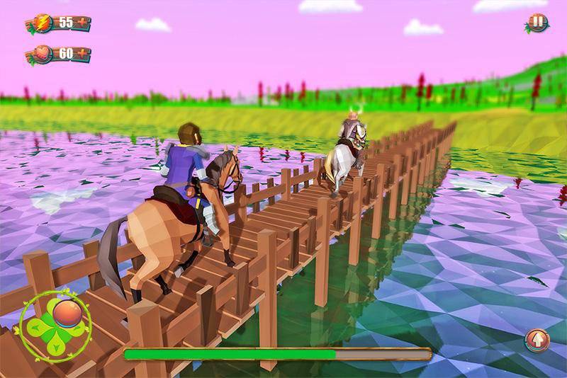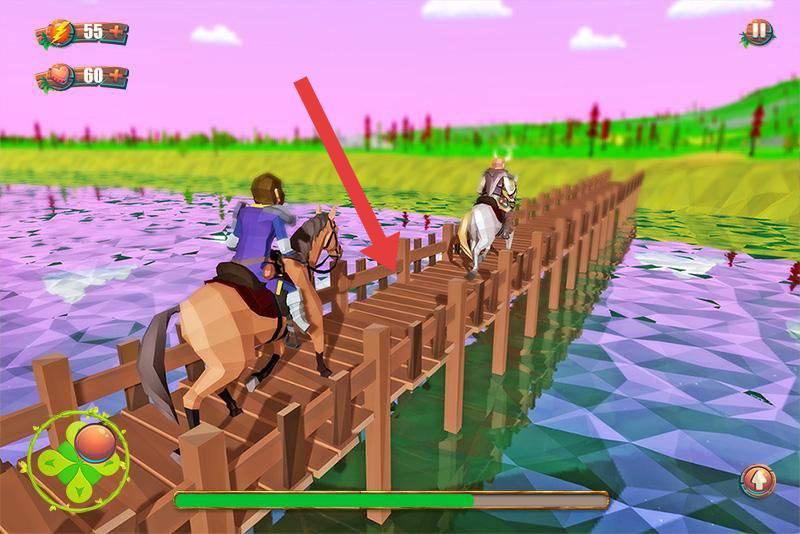 2、驾驶马匹通过木桥时,沿箭头方向前进,注意保持平衡,顺利通过桥梁,避免掉落水中,确保游戏角色和马匹的安全。