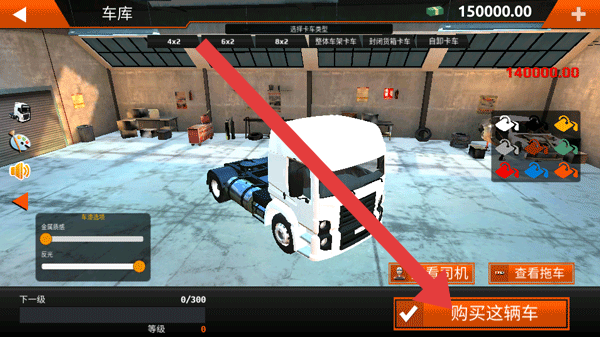 3、在世界卡车驾驶模拟的车库界面,点击【购买这辆车】按钮(箭头所指),完成车辆购买操作。