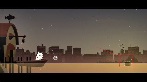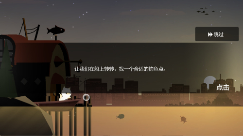 1、在夜幕下的船屋场景中,玩家需操控猫咪转动小船寻找最佳钓鱼点,观察水面微光提示选定位置后准备抛竿。