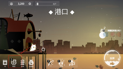 3、在港口码头钓鱼时,可查看右上角鱼获展示框,使用右下角投掷按钮进行操作,积累金币解锁更多建筑功能。