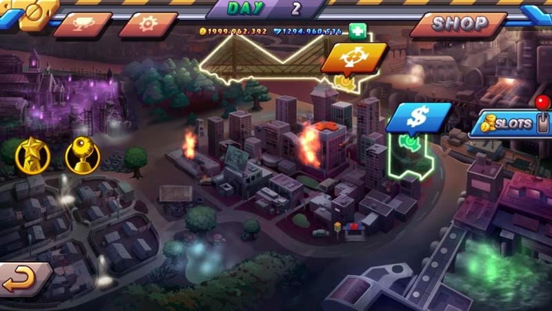 2、战斗间隙,利用获取的资源升级或购买新武器,添置特殊道具与机甲设备,通过训练英雄获取额外收益,提升自身实力。