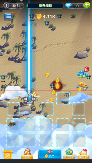 2、合成同类战机,消耗金币升级获得更强大战斗力。合成需要消耗2000-10000金币,随等级提升而增加。