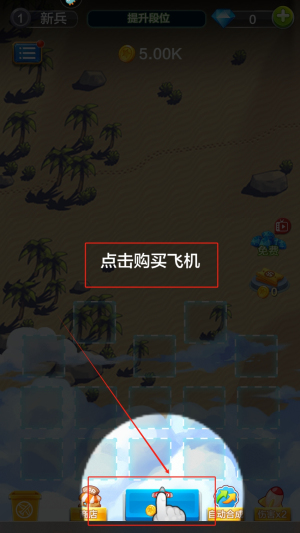1、在游戏主界面点击红框标注的点击购买飞机按钮,进入商店浏览可购买的飞机型号,消耗5.00K金币获取基础战机。