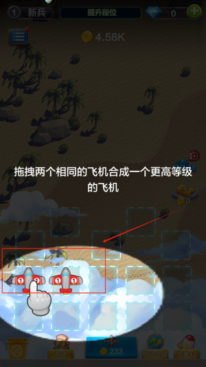 2、将两只相同等级的飞机拖拽至红框标注的合成区域,消耗4.58K金币完成合成,获得更高等级的战机提升战力。