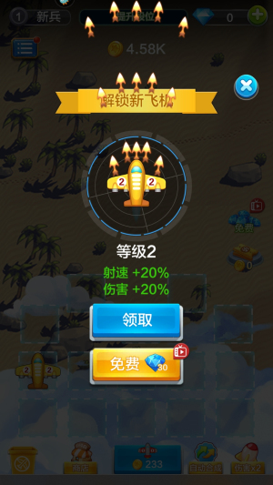 3、在升级界面查看等级2飞机的属性加成,点击领取按钮获取射速+20%和伤害+20%的强化效果,提升作战能力。