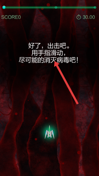 2、根据提示操作,【用手指滑动】战机,移动并射击,尽可能消灭病毒,完成出击任务。