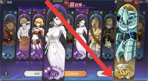 2、抽卡界面“喜获”角色后,查看SSR/SR品质(如图片中角色),编入队伍,利用属性克制,搭配阵容推图。