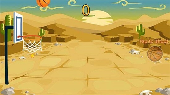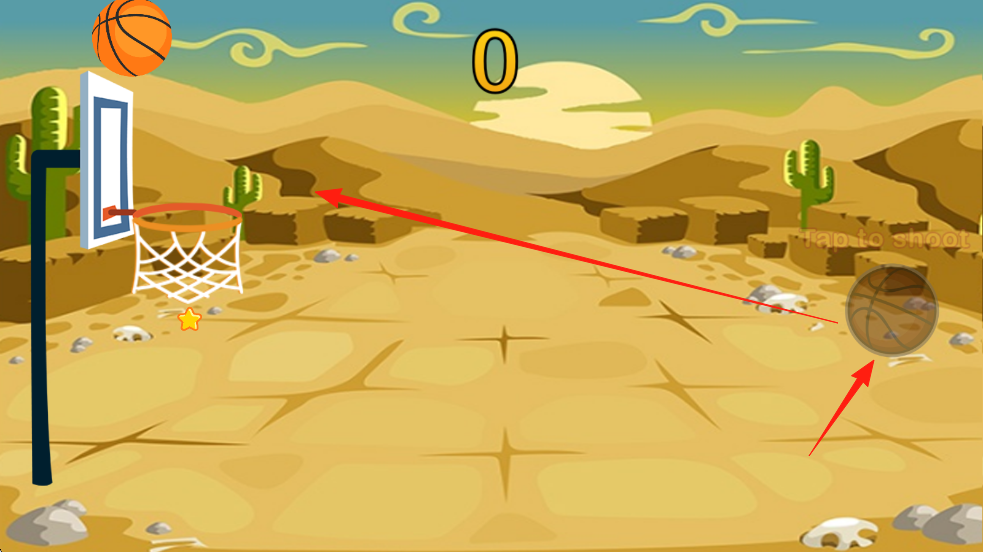 2、游戏投篮界面,显示篮球、篮筐,红色箭头指引投篮操作,上方有数字0,背景沙漠。