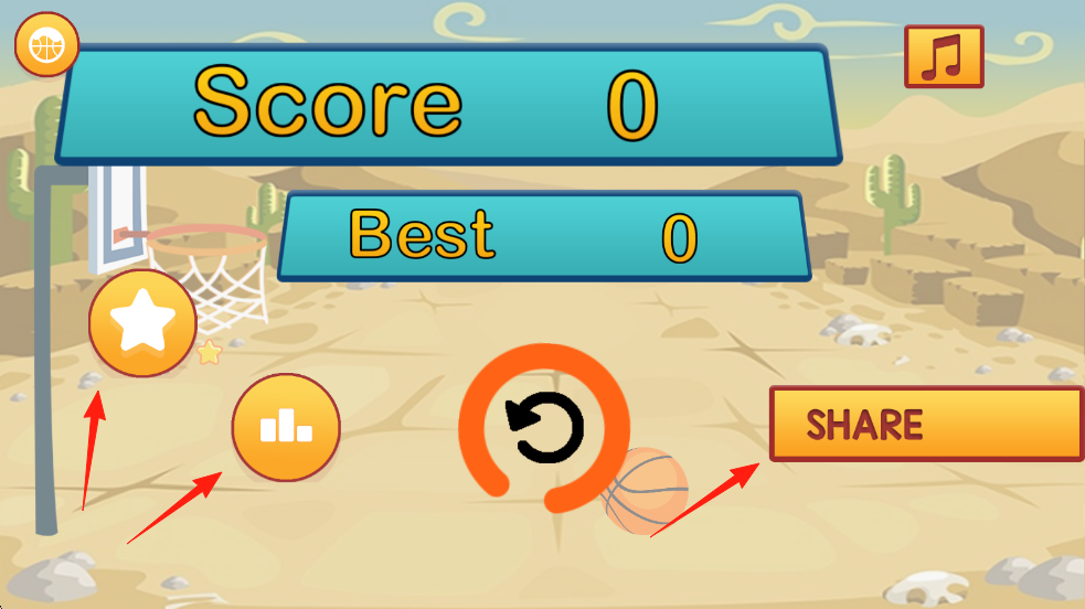 1、游戏启动界面,有PLAY!(开始游戏)SHARE(分享)按钮,背景是沙漠篮球场景,还有音乐开关、篮球图标。
