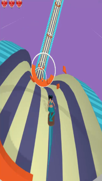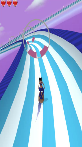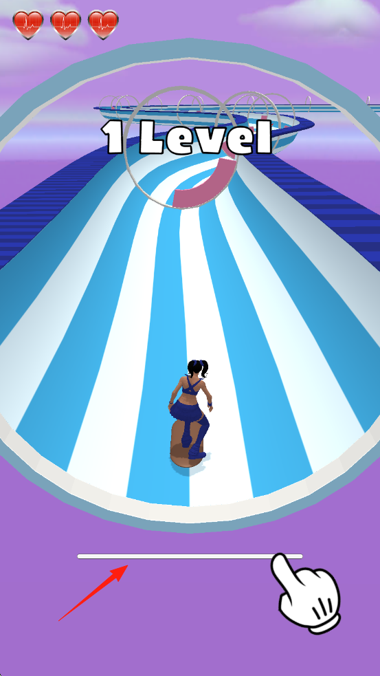 1、游戏关卡“1Level”,角色在蓝白赛道,界面有三颗心(生命值)、手指指引操作,背景是紫色天空。