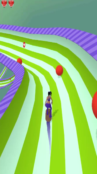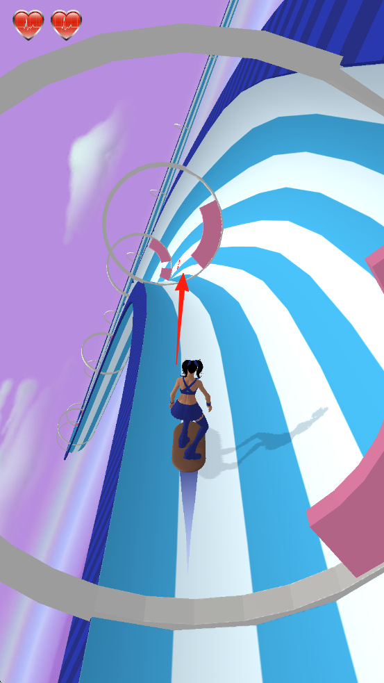 3、游戏进行中,角色在赛道,红色箭头指向需穿过的环形障碍,生命值剩2颗。