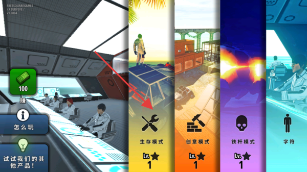 1、进入游戏主界面,左上角【怎么玩】可帮助了解游戏规则,下方有【生存模式】【创意模式】【铁杆模式】等选项。