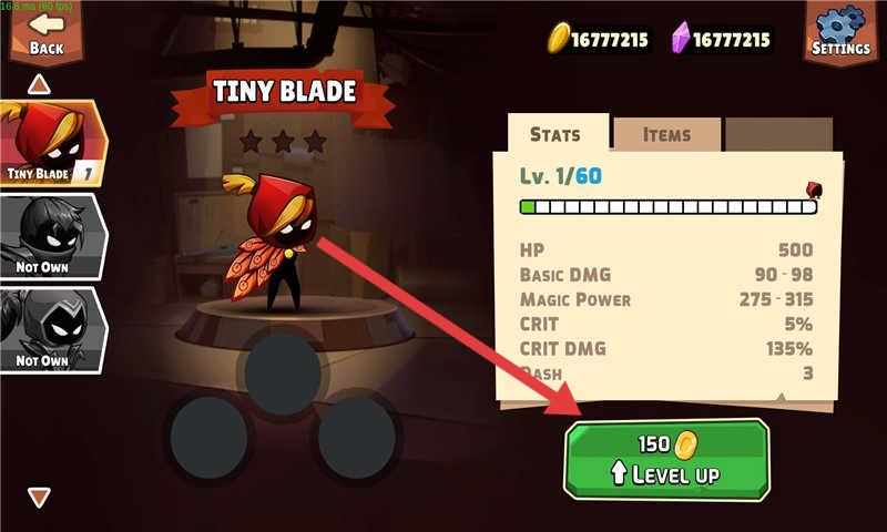 3、在角色界面,消耗150金币点击【LEVEL-UP】提升等级,增强【TINY-BLADE】属性再战。