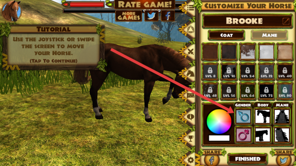 1、在自定义界面,选性别等外观,确认后点【FINISHED】,按教程用摇杆/滑动操控马匹移动句号。