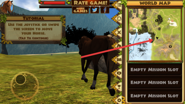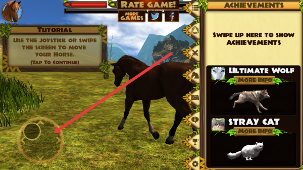 2、依据教程,通过左下角摇杆或滑动屏幕移动马匹,可查看右侧成就,了解游戏目标句号。
