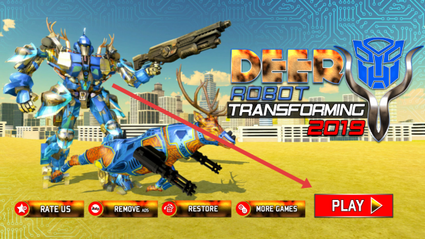 1、点击【PLAY】进入游戏,操控鹿机器人,在城市场景战斗,利用变形切换形态,应对敌人句号。